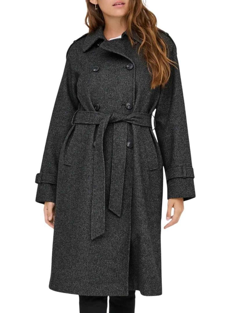 Sobretudo Only. Modelo Lasta. Cor cinza escuro mesclado. Fecho de botões cruzado. Ajuste reto. Cinto de auto-amarrar combinando. Bolsos laterais. Comprimento abaixo dos joelhos.