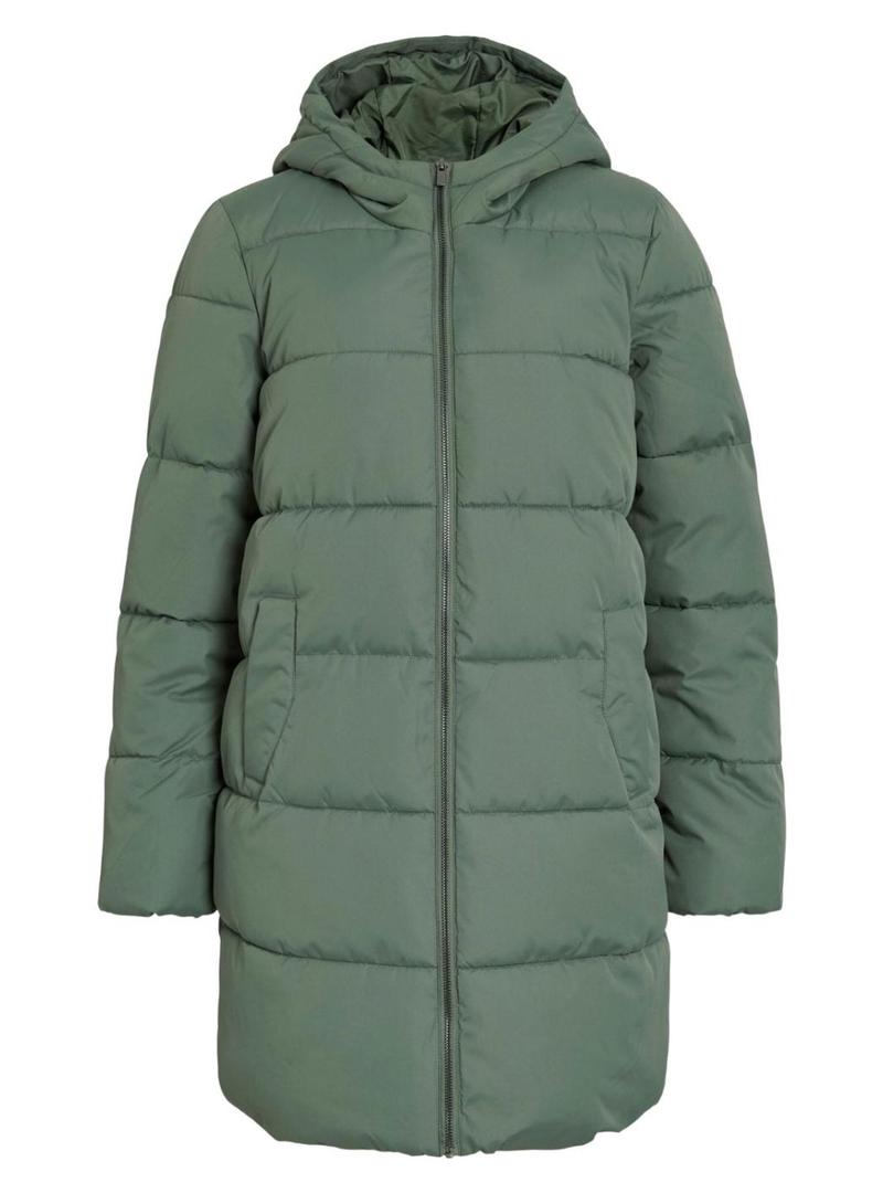 Casaco acolchoado Vila. Modelo Karla. Cor verde. Fecho com zíper. Bolsos laterais. Com capuz. Corte reto. Comprimento acima dos joelhos.