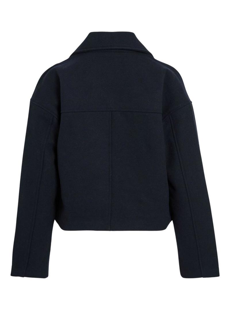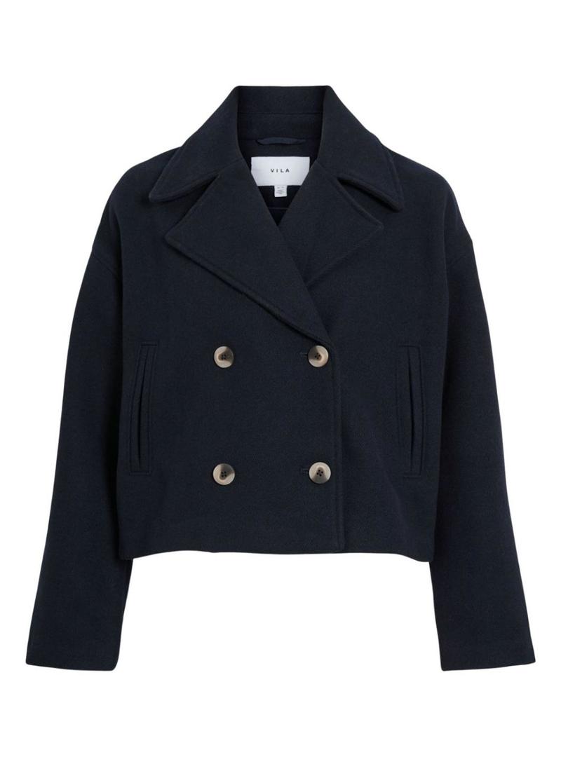 Casaco curto da marca Vila. Modelo Kamina. Cor azul marinho. Fechamento cruzado com botões. Corte cropped. Bolsos laterais. Ajuste folgado. Corte reto.