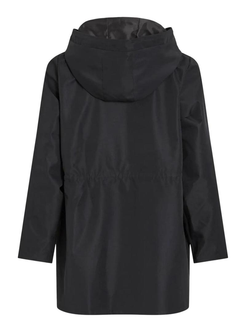 Impermeável Vila. Modelo Vitally. Cor preta. Fecho com zíper bidirecional. Capuz com cordão ajustável. Bolsos laterais com aba. Cintura com elástico ajustável por dentro. Resistente à água.