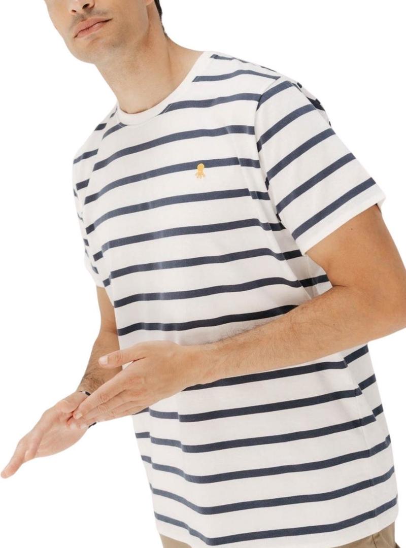 Camiseta El Pulpo. Modelo listras. Cor branco e azul marinho. Estilo básico. Logotipo bordado no peito em cor amarela. Manga curta. Ajuste regular. Listras na horizontal.