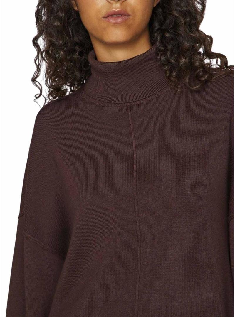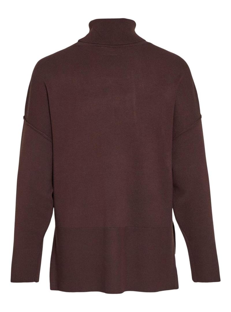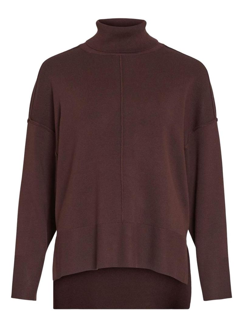 Camisola Vila. Modelo Viostria. Cor marrom. Gola alta com dobra. Manga comprida. Ajuste folgado. Estilo básico. Extremidades caneladas. Pequenas aberturas laterais. Parte de trás ligeiramente mais comprida que a frente.