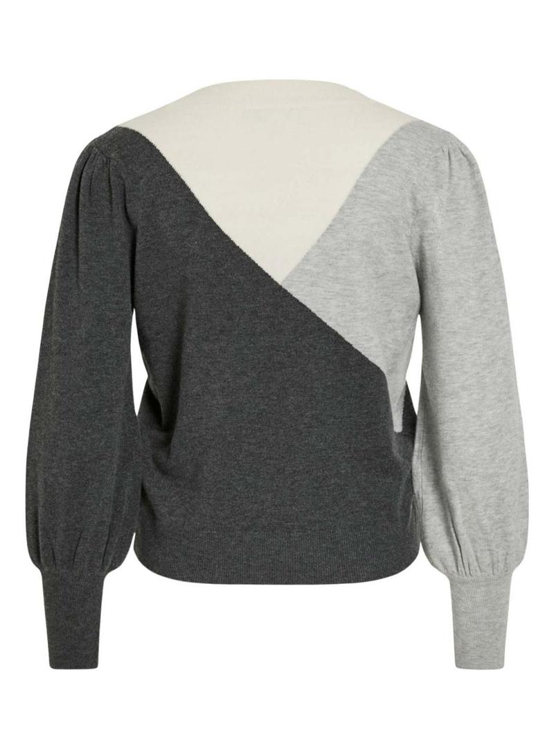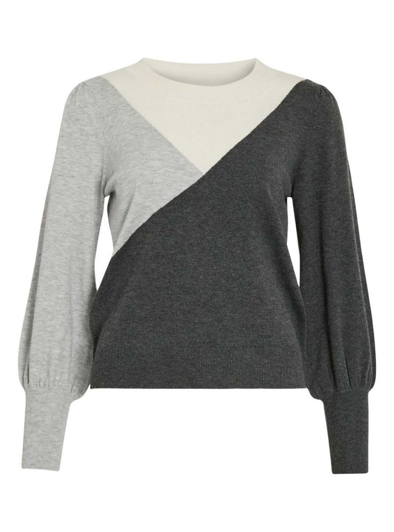 Camisola Vila. Modelo Kerry. Cor cinza e bege. Gola redonda. Extremidades caneladas. Mangas com leve volume. Ajuste regular. Padrão geométrico de três cores.