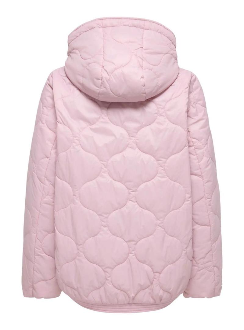 Casaco Only. Modelo Miki. Cor rosa com forro bege. Tecido acolchoado geométrico. Ajuste folgado. Fecho com zíper. Capuz com cordão ajustável. Bolsos laterais. Extremidades elásticas. Ajuste folgado. Corte estilo capa. Parte de trás mais comprida que a parte da frente.