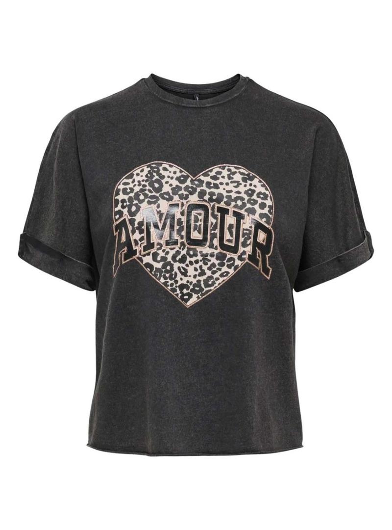 Camiseta Only. Modelo Lucy. Cor preto. Efeito desgastado. Gola redonda. Ajuste folgado. Manga curta com dobra. Coração com estampa de animal print no peito com a mensagem Amour.
