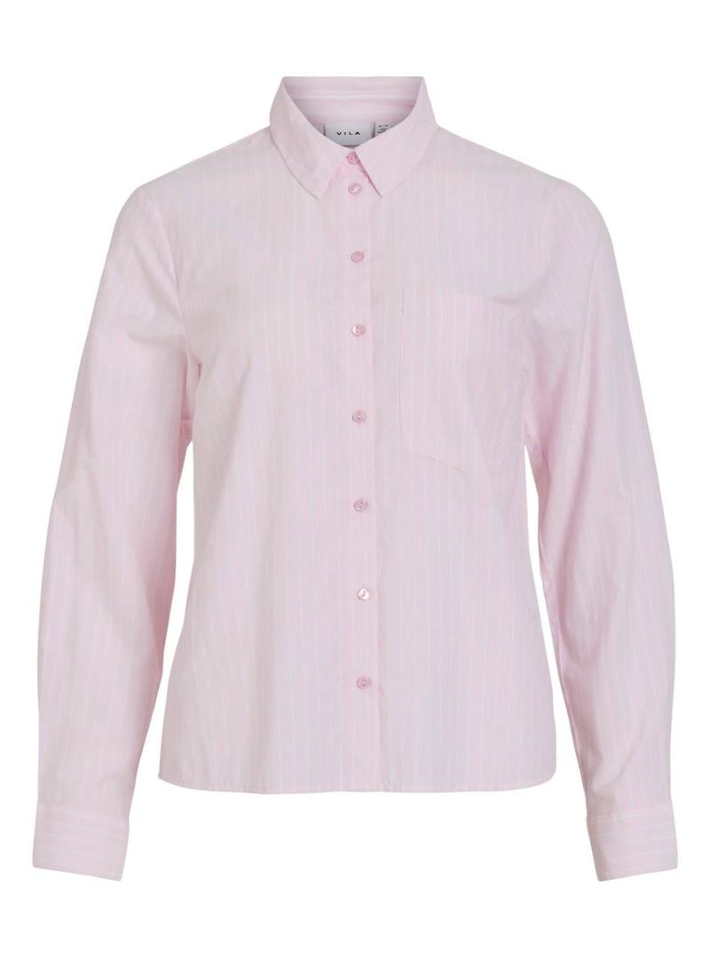 Camisa Vila. Modelo Darma. Cor rosa. Tecido com listras verticais em branco. Gola regular. Ajuste reto. Fechamento com botões.