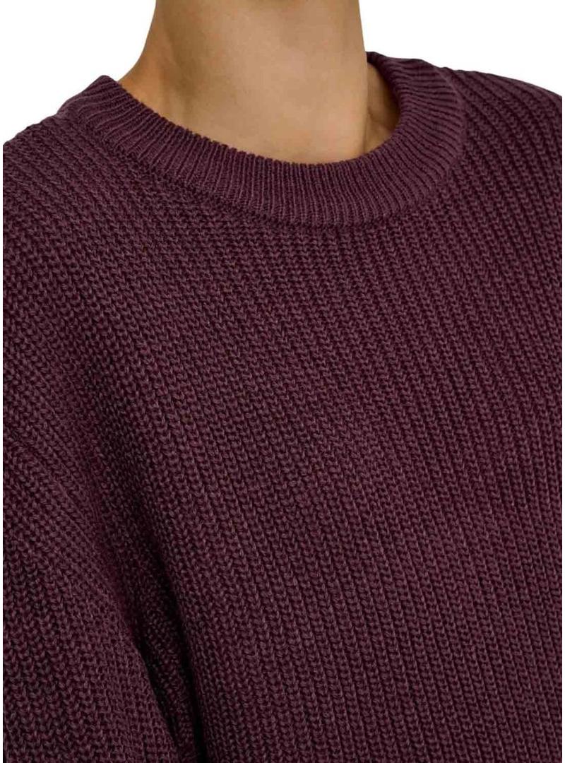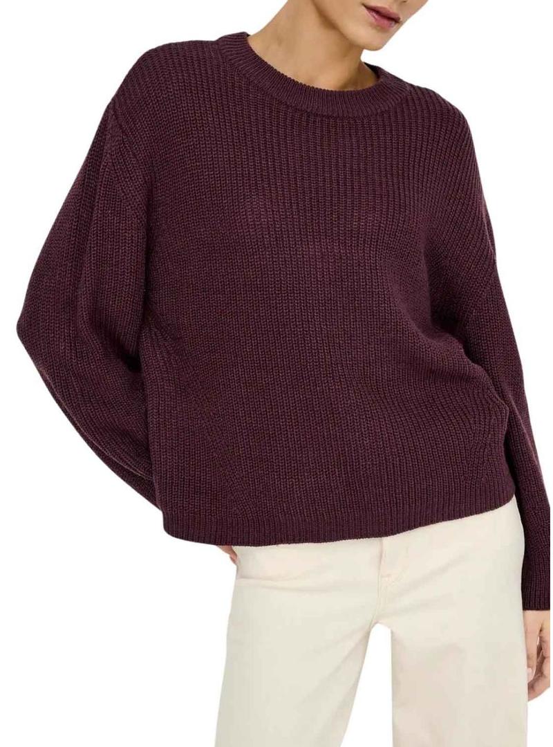 Camisola Only. Modelo Milouz. Cor granada. Gola redonda. Manga comprida. Ajuste reto. Tecido de malha grosso em relevo. Ombros caídos. Estilo básico.