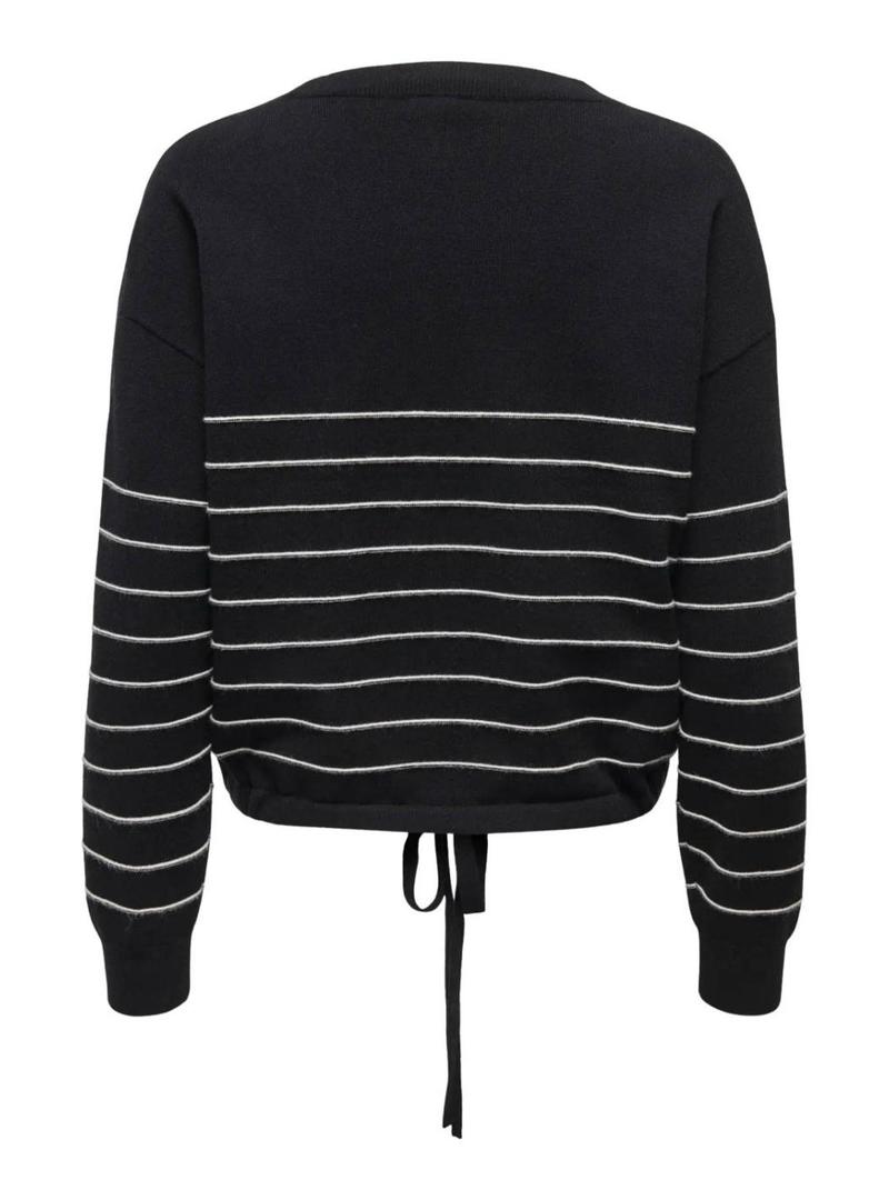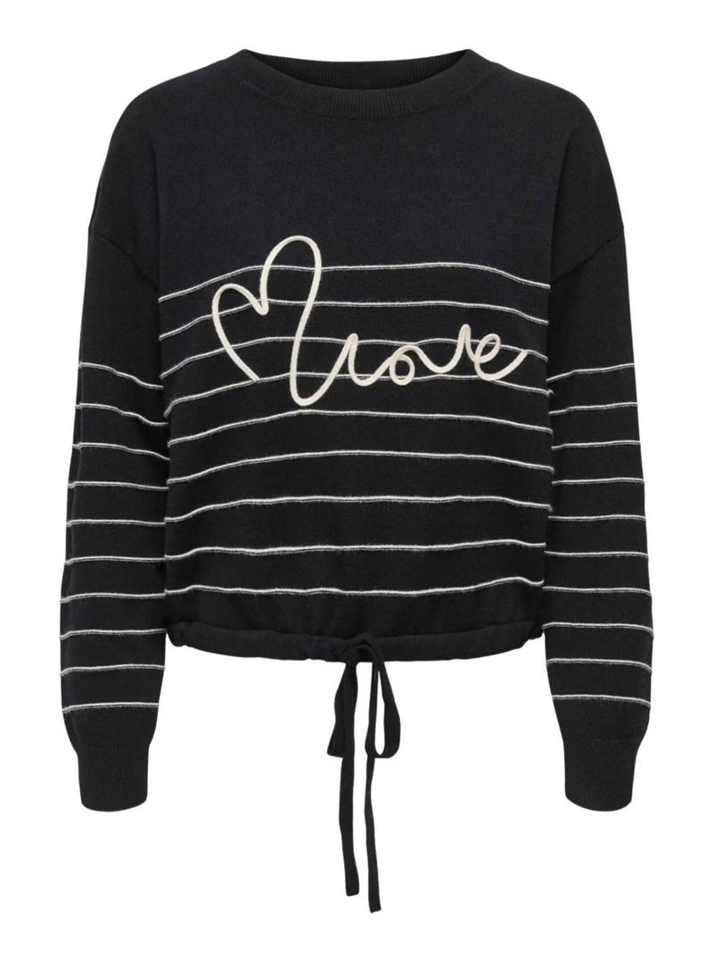 Camisola Only. Modelo Signe. Cor preto. Gola redonda larga. Ombros caídos. Ajuste folgado. Listras em cor bege. Extremidades das mangas caneladas. Barra com cordão ajustável para auto-amarrar. Mensagem no peito.