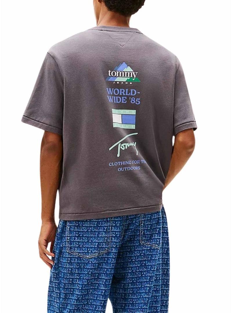 Camiseta Tommy Jeans. Modelo 90S. Cor cinza antracite. Ajuste folgado. Gola redonda. Manga curta. Logotipo estampado no peito e nas costas. Estilo vintage.