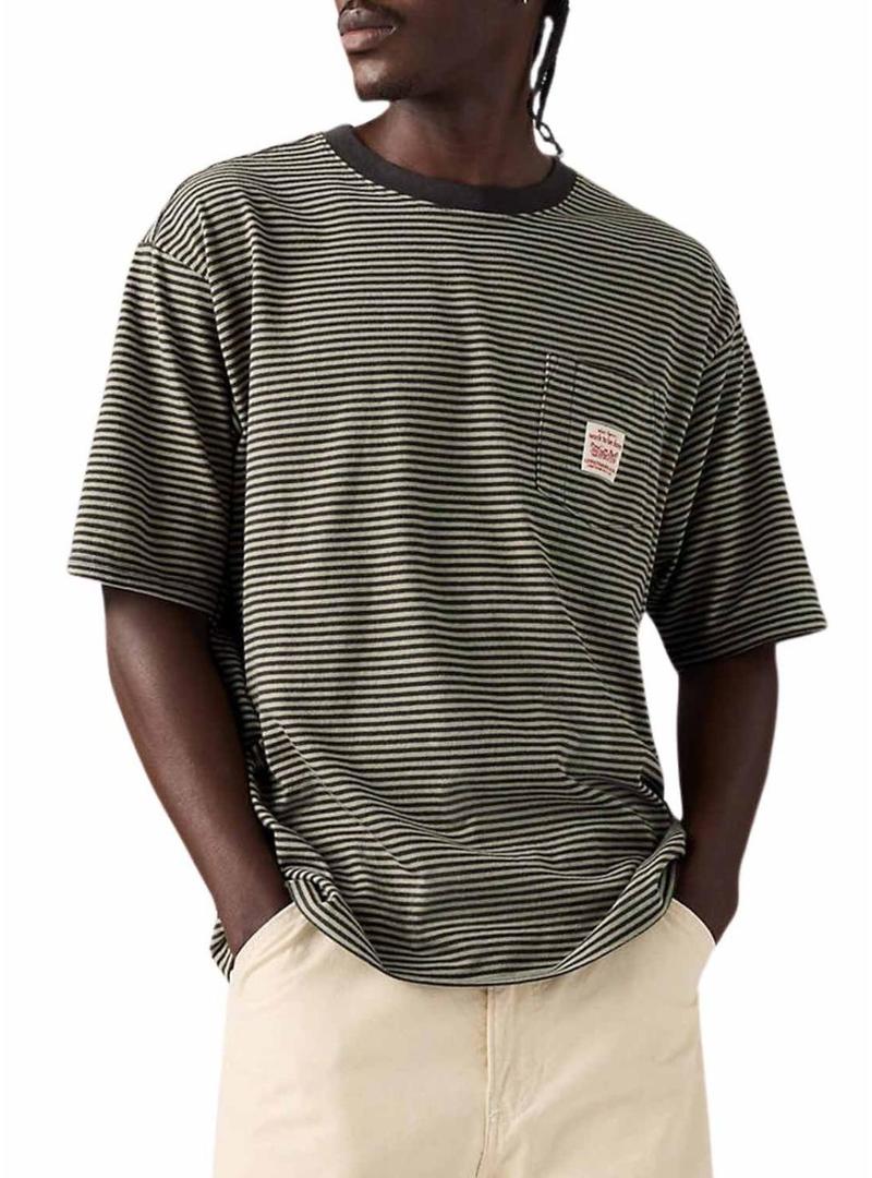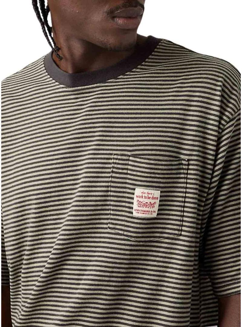 Camiseta Levis. Modelo Worker. Cor verde sálvia e antracite. Gola redonda. Tecido de listras horizontais finas. Manga curta. Ajuste folgado. Bolso no peito com etiqueta vintage bordada.