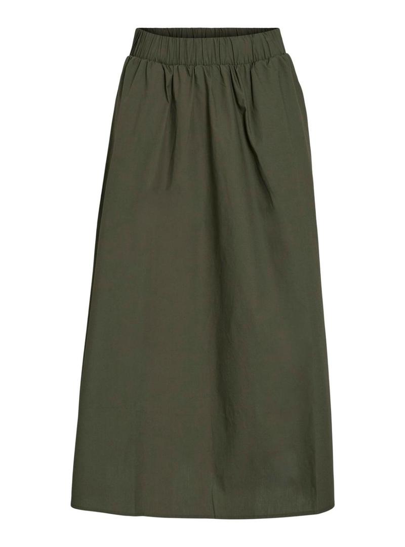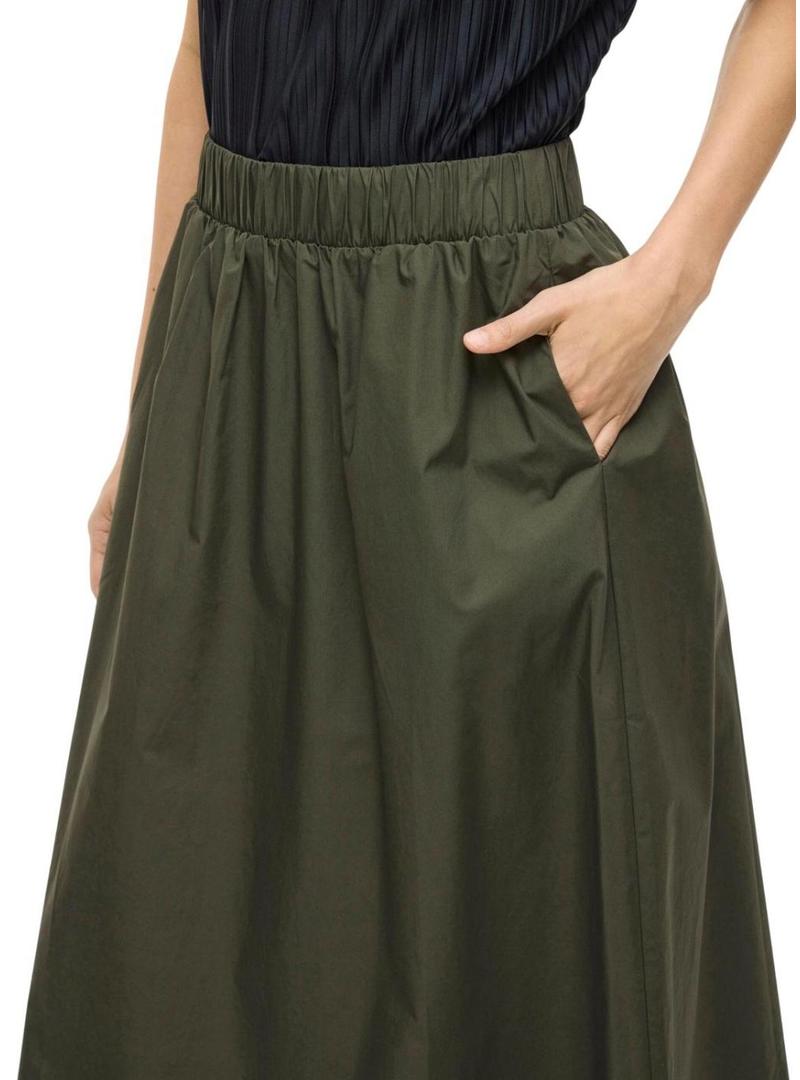 Saia Vila. Modelo Visophie. Cor verde. Cintura alta. Bolsos laterais. Comprimento midi. Cintura elástica. Corte com volume.