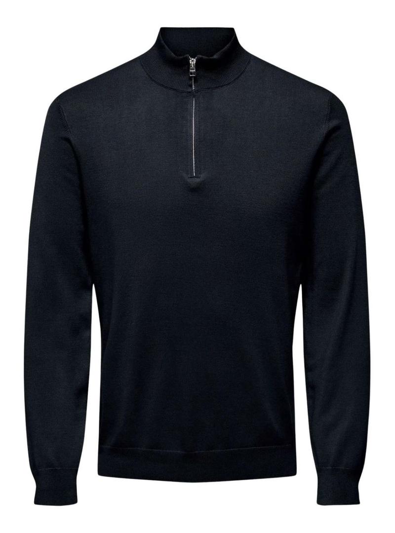 Camisola Only and Sons. Modelo Wyler Half Zip. Cor azul marinho. Gola alta com meio zíper. Extremidades caneladas. Ajuste regular. Tecido de malha macia. Estilo básico.