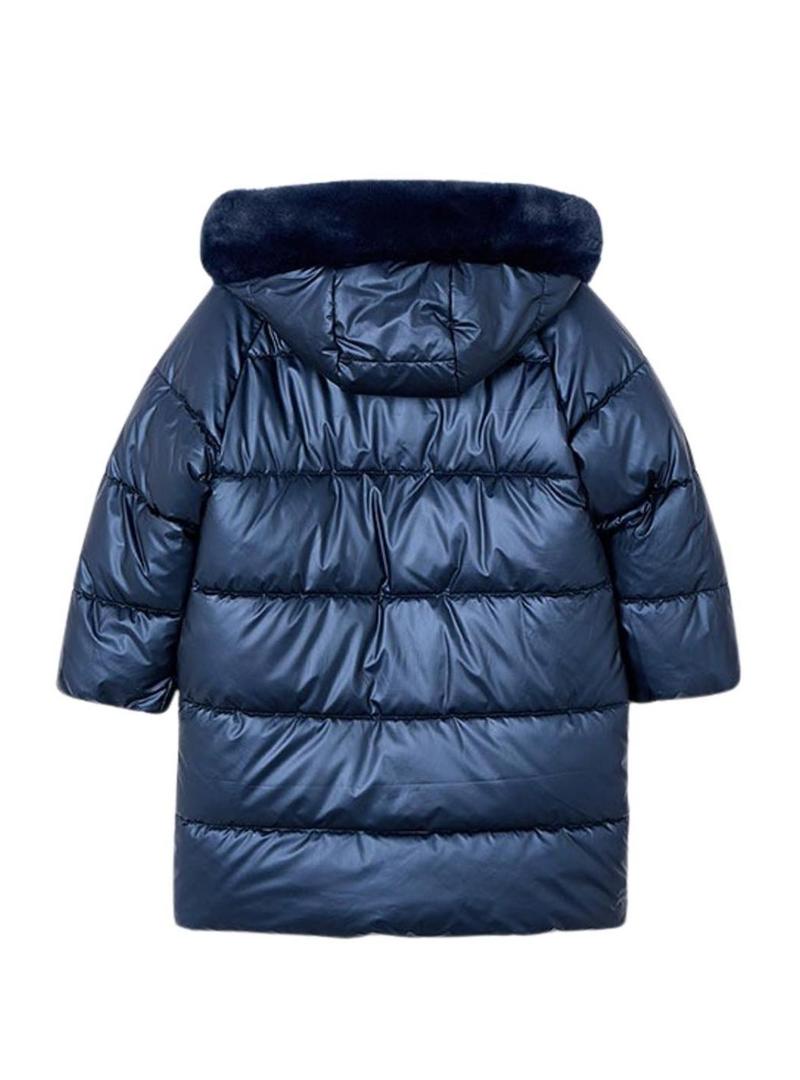 Casaco acolchoado Mayoral. Cor azul brilhante. Fecho com zíper e botões de pressão. Capuz removível. Comprimento pelos joelhos.