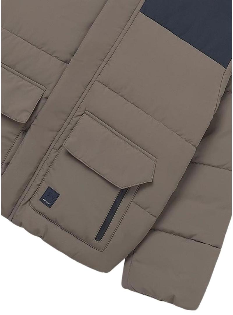 Casaco acolchoado Mayoral. Modelo bicolor. Marrom e azul marinho. Gola alta. Fecho com zíper oculto. Bolsos laterais com aba e zíper. Patch da marca em borracha.