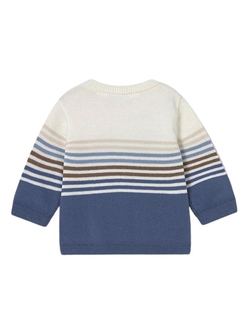 Camisola Mayoral. Modelo azul e bege. Gola redonda. Fechamento com dois botões. Extremidades caneladas. Barra com logo da marca. Estampado com listras.