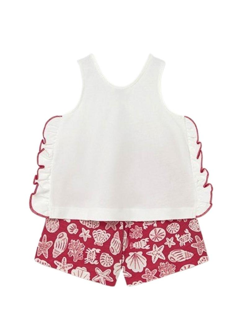 Conjunto Mayoral. Modelo Caranguejo. Cor branco e vermelho. Parte superior com alças. Laços decorativos. Babados laterais. Shorts estampados com detalhes marinhos. Cintura elástica.