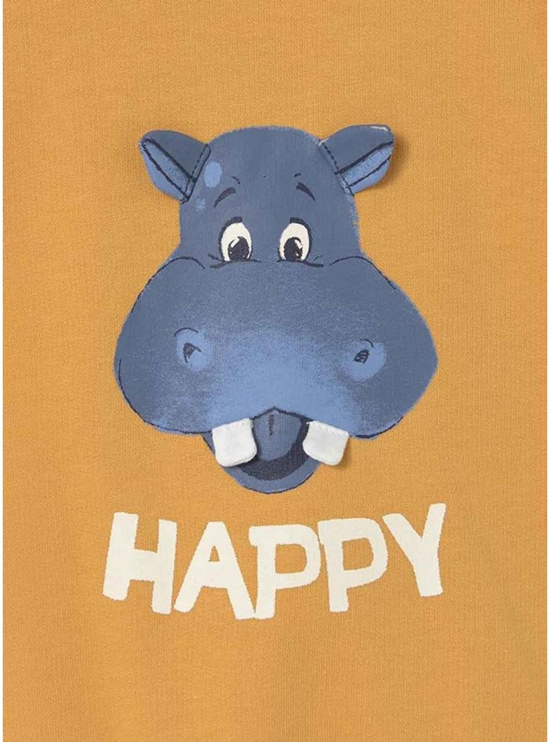 Moletom Mayoral. Modelo Happy. Cor laranja. Gola redonda com botões. Extremidades caneladas. Ajuste regular. Ilustração de hipopótamo estampada na frente com orelhas em relevo.