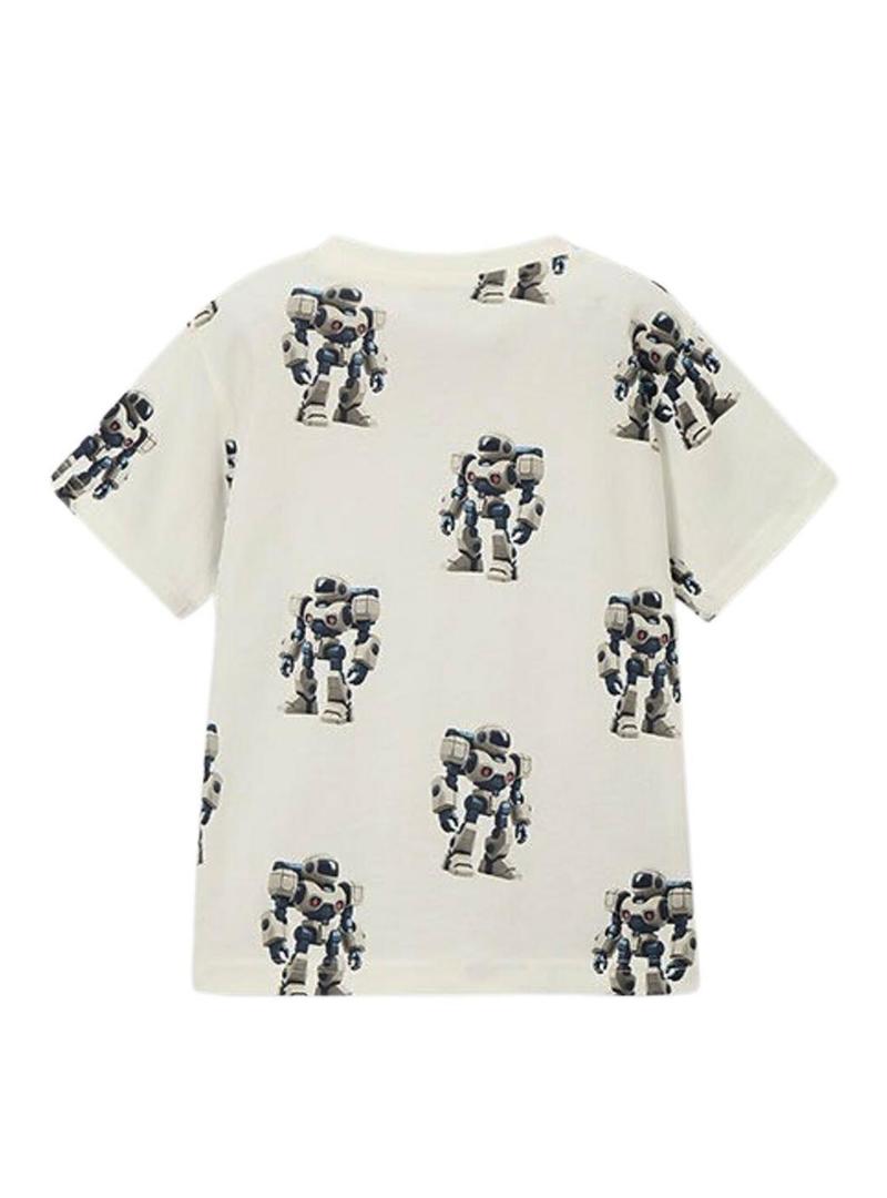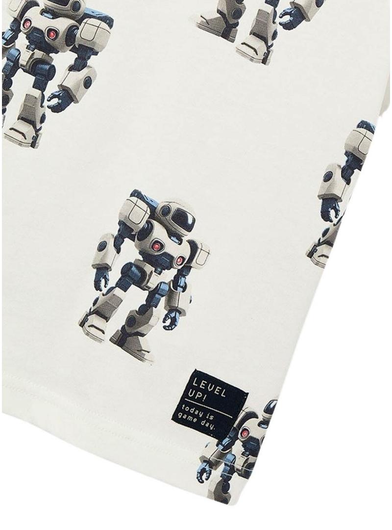 Camiseta Mayoral. Gola redonda. Mangas curtas. Estampa de robôs por todo o tecido. Patch na parte frontal. Corte regular.
