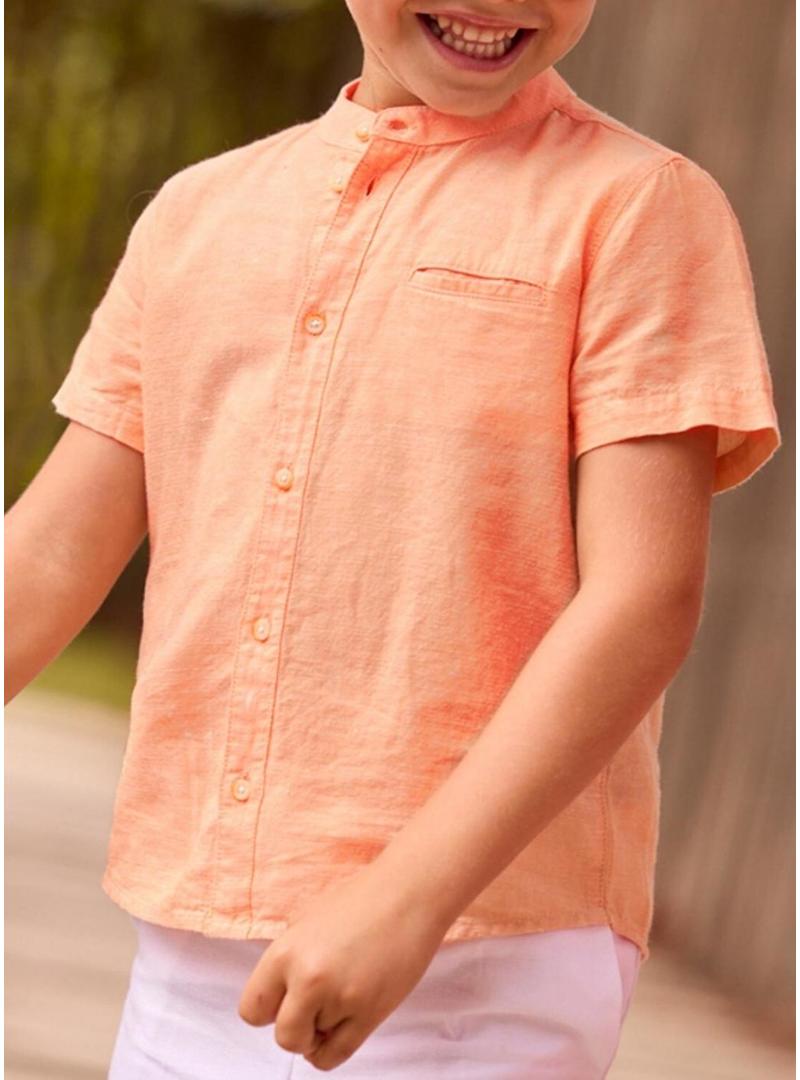 Camisa Mayoral. Manga curta. Gola mao. Fecho com botões. Bolso embutido. Cor coral. Confeccionado em mistura de linho e algodão.