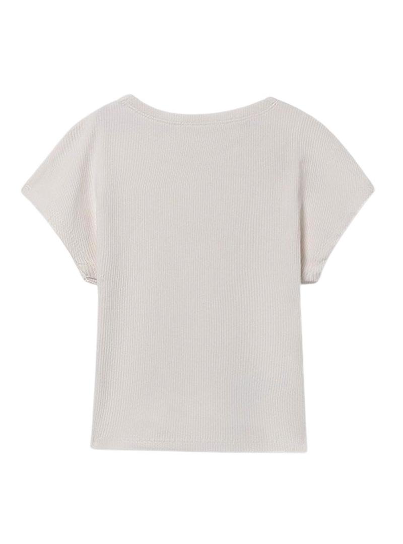 Camiseta Mayoral. Modelo canelado. Cor branco quebrado. Gola redonda. Manga curta. Logotipo circular na parte inferior. Corte ajustado. Estilo básico.