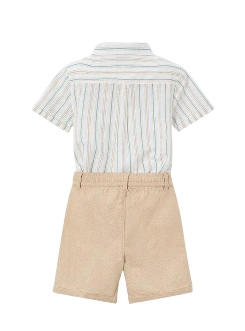 Conjunto de bermuda e camisa Mayoral. Gola da camisa. Bolso no peito. Fecho de botões. Manga curta. Padrão às riscas. Bermuda cor bege com fecho de botão. Passadores na cintura. Bolsos laterais. Bermuda com cintura ajustável com cordão.