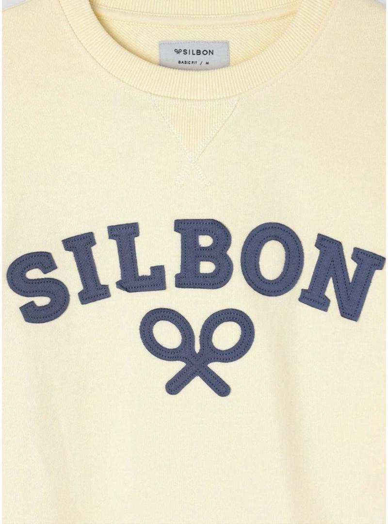 Moletom Silbon. Modelo Raqueta. Cor amarelo manteiga. Gola redonda. Extremidades caneladas. Ajuste regular. Logotipo bordado em relevo no peito em azul marinho.