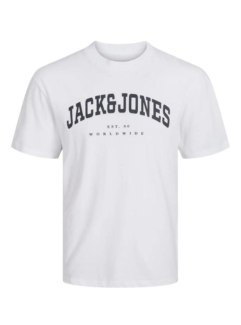 Camiseta Jack and Jones. Cor branca. Gola redonda. Manga curta. Corte relaxado. Ombros caídos. Logotipo varsity em relevo no peito.