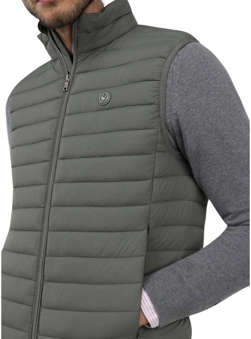 Colete acolchoado El Ganso. Modelo básico. Cor verde. Gola alta. Fecho com zíper. Logo circular no peito. Tecido acolchoado leve resistente à água. Bolsos laterais. Axila elástica.