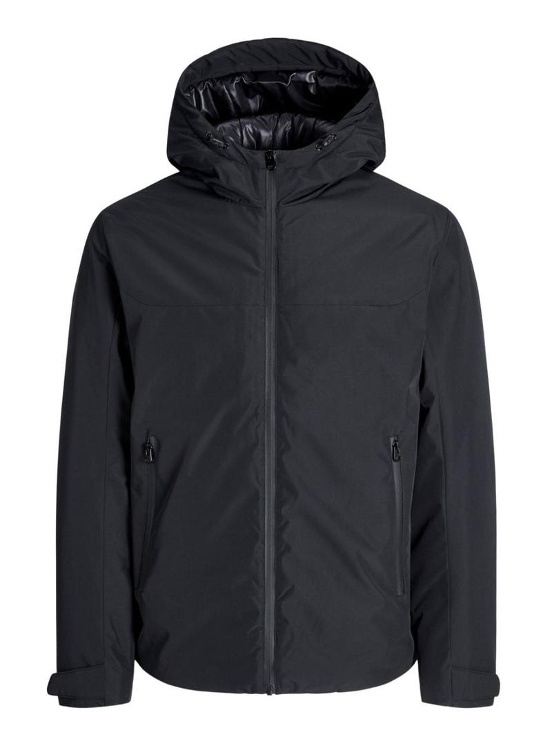 Jaqueta Jack and Jones. Modelo Brandon. Cor preta. Estilo corta-vento. Fechamento com zíper. Gola alta. Capuz ajustável com elástico. Punhos com velcro ajustável. Bolsos laterais. Tecido acolchoado.