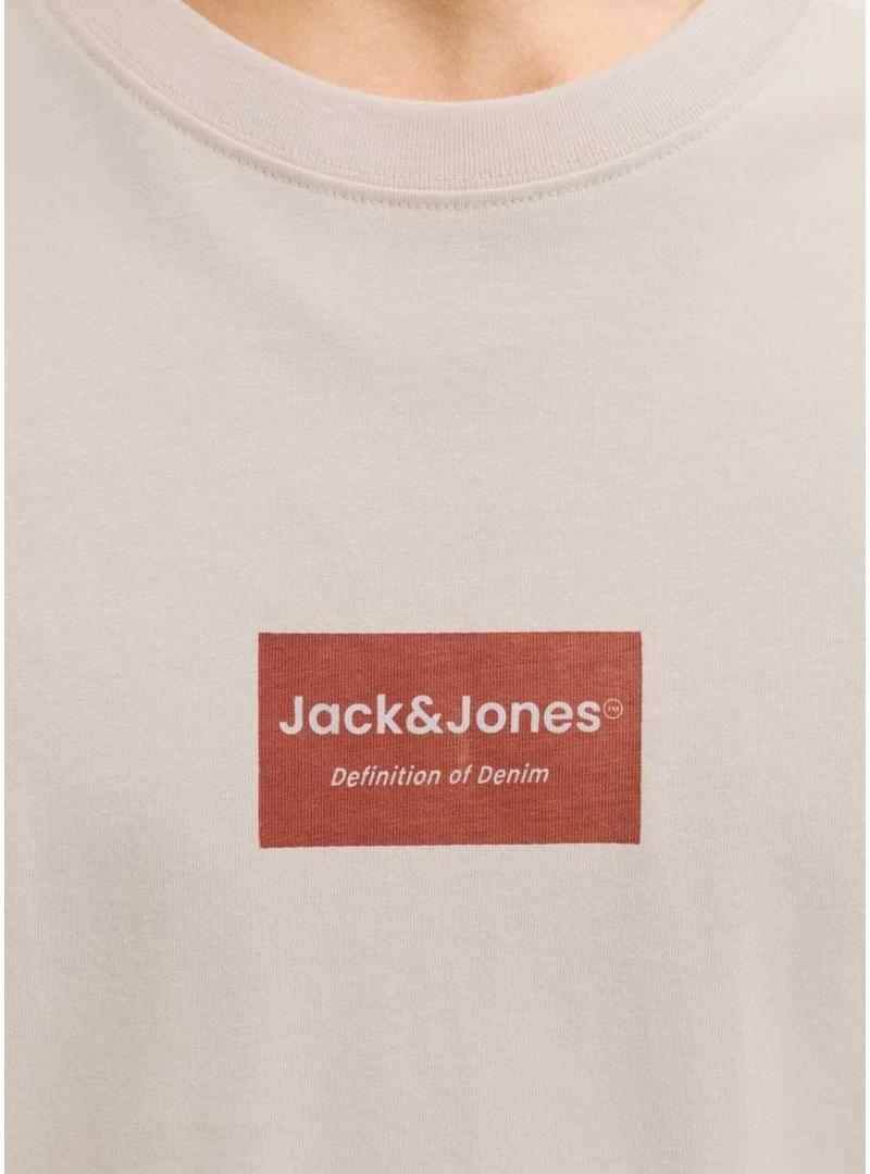 Camiseta Jack and Jones. Modelo Frank. Cor bege. Gola redonda. Manga curta. Corte folgado. Estampado na parte frontal.