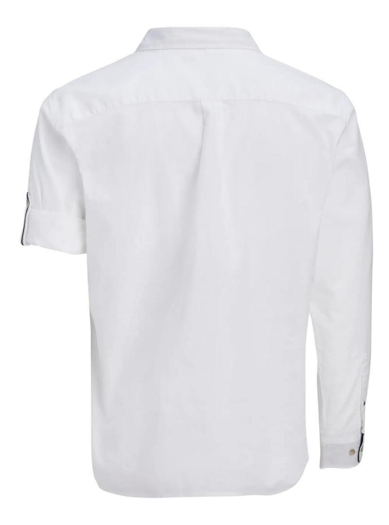 Camisa Jack and Jones. Modelo Henry. Cor branca. Ajuste regular. Estilo básico. Manga longa conversível com presilha. Algodão leve e transpirável. Fita em contraste azul e vermelho.