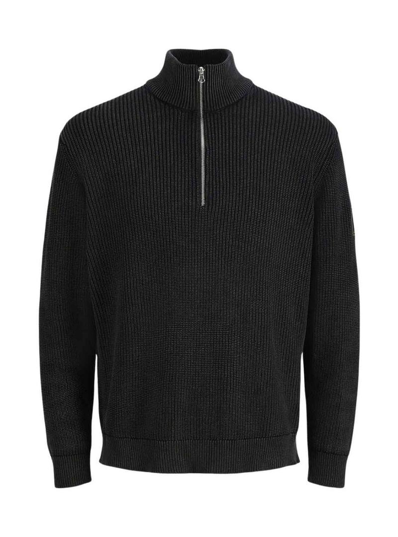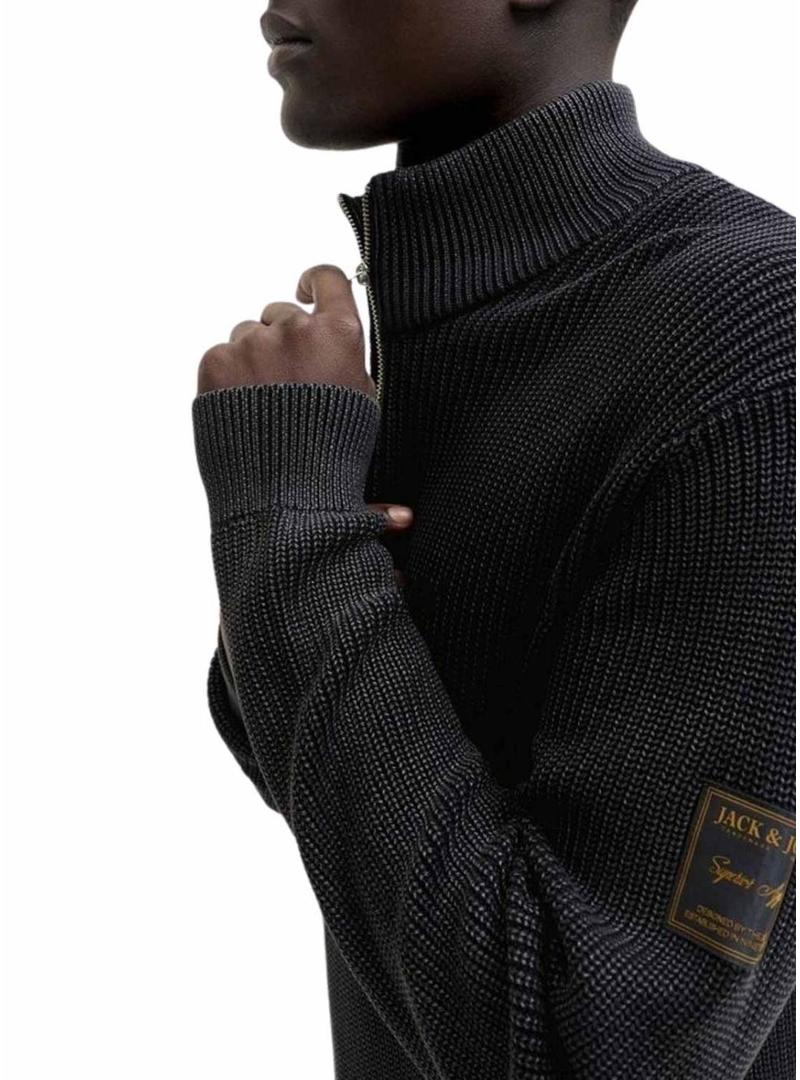 Jersey Jack and Jones. Modelo Detroit. Cor preta. Gola alta com meio fecho de correr. Ajuste regular. Manga comprida. Extremidades elásticas. Tecido canelado.