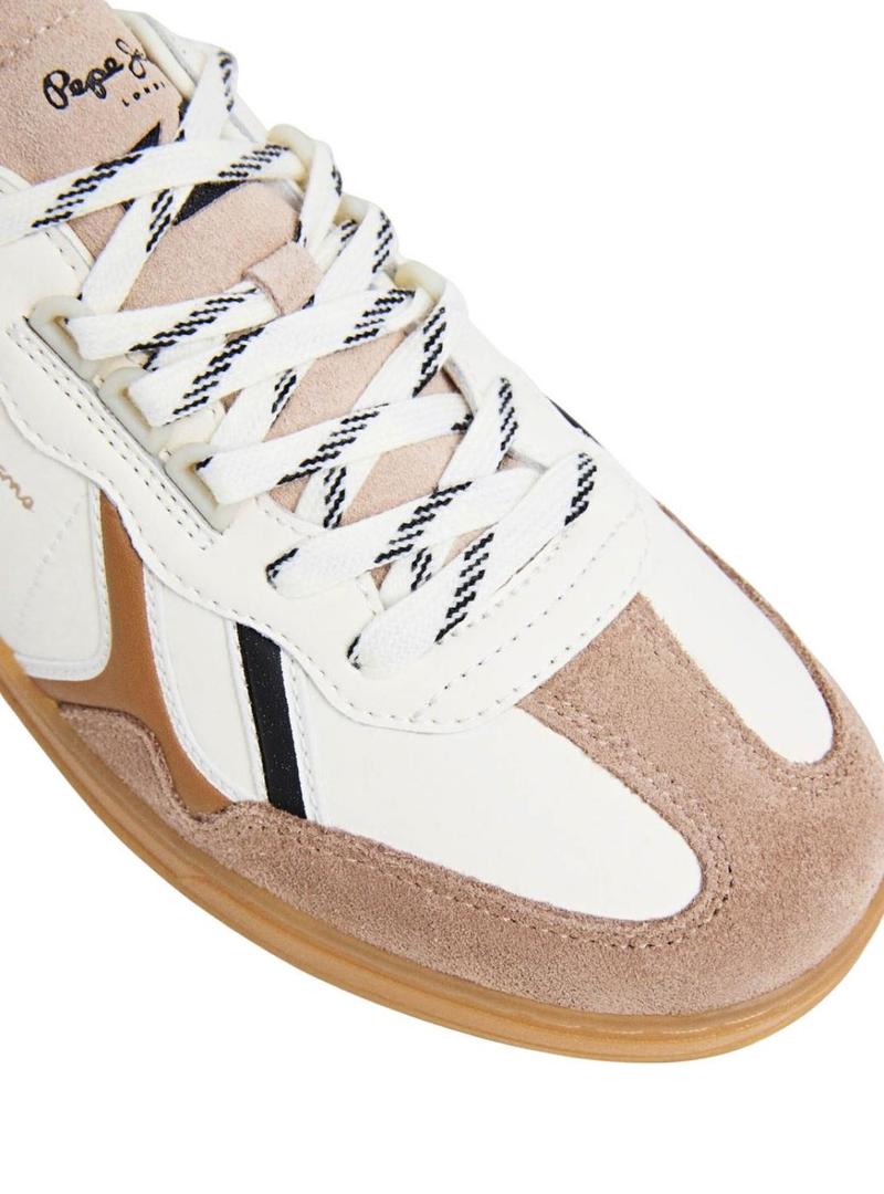 Sapatilhas Pepe Jeans. Modelo Ball Mood. Cor branca. Painéis de camurça em cor bege. Fecho com cordões. Detalhes em preto. Sola de borracha em cor natural translúcida. Palmilha termoformada e removível.