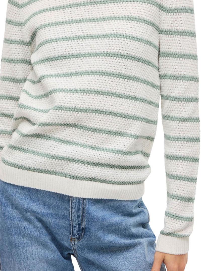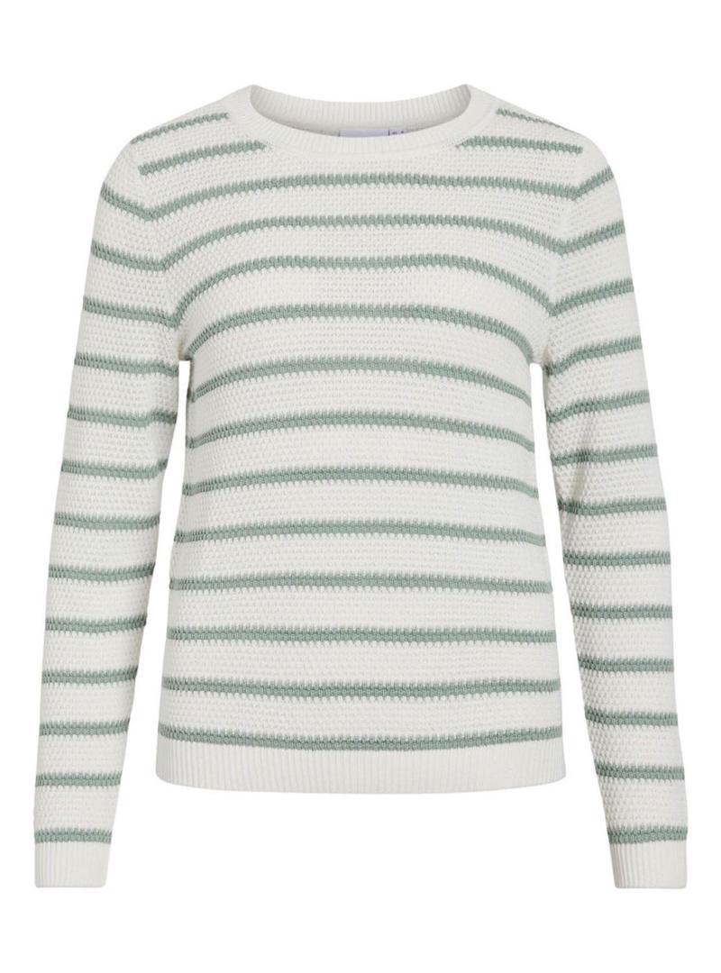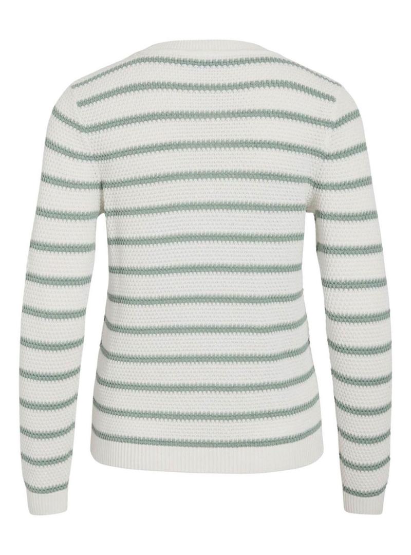 Camisola Vila. Modelo Vidalo. Cor branca e verde. Listras horizontais. Gola redonda. Pontas caneladas. Ajuste regular. Manga comprida. Tecido com textura.