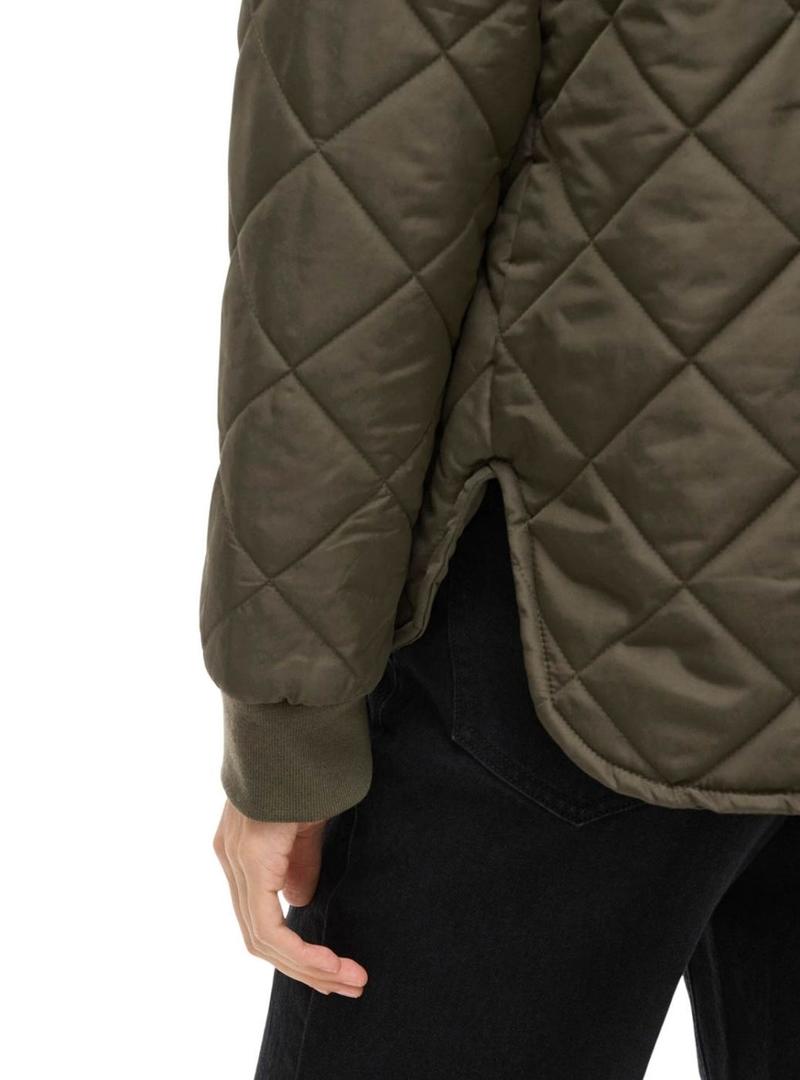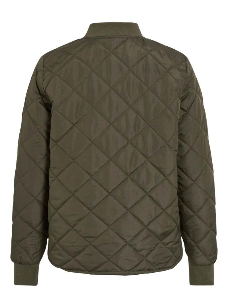 Casaco Vila. Modelo Vitate. Cor verde. Estilo bomber. Acolchoado em forma de losangos. Fecho com zíper. Barra arredondada. Punhos elásticos. Bolsos laterais com botão de pressão. Gola canelada.