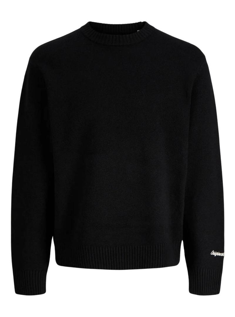 Camisola Jack and Jones. Modelo Norrebro. Cor preta. Gola redonda. Extremidades caneladas. Ajuste regular. Manga comprida. Marca Original Studio bordada na manga em cor branca.