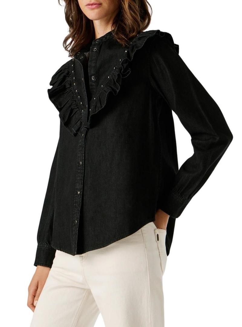 Camisa de ganga Pepe Jeans. Modelo Katia. Cor preto. Gola mao. Fechamento com botões de pressão. Manga comprida. Peitilho com babados e tachas metalizadas. Ajuste reto.