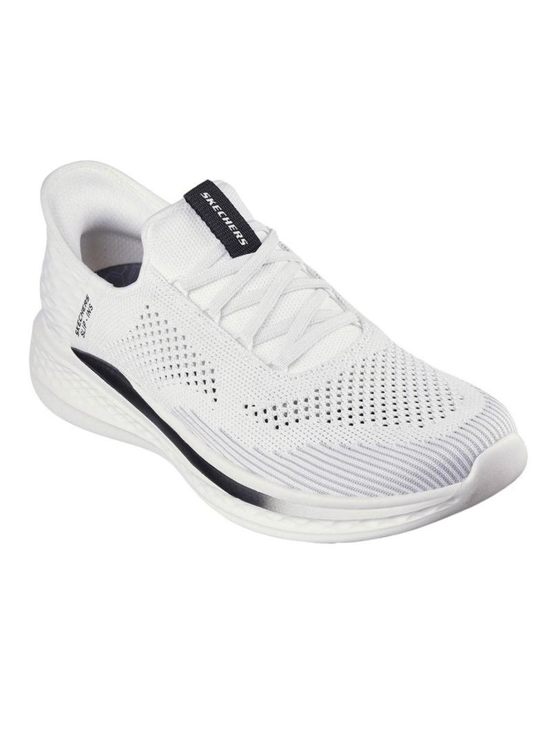 Tênis Skechers. Modelo Slade Quinto. Cor branca. Design com tecnologia Heel Pillow para um ajuste confortável. Parte superior em malha respirável. Cadarços elásticos. Palmilha Skechers Air-Cooled Memory Foam com infusão de carvão. Suporte Skechers Goga Mat Arch. Design confortável. Fácil de calçar, projetado para ser usado sem as mãos.