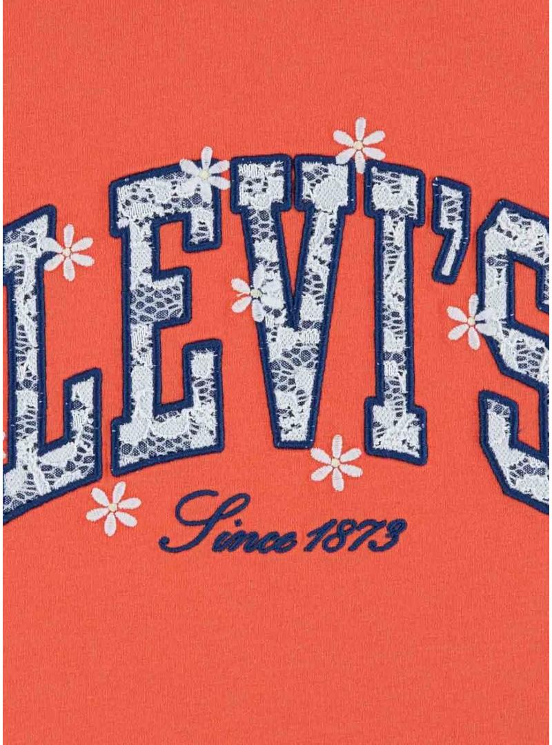 Camiseta Levis. Modelo Chambray Applique. Cor laranja. Gola redonda canelada. Manga curta. Decoração bordada com aplique de crochê.