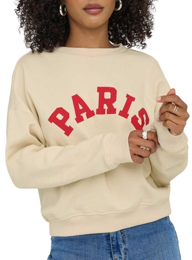 Moletom Only. Modelo Onlsweat Life. Cor bege. Gola redonda. Ombros caídos. Acabamentos canelados. Corte folgado. Gráfico Paris estampado no peito.