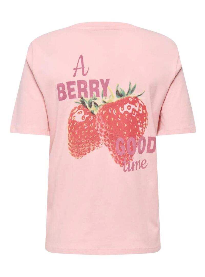 Camiseta Only. Modelo Lucy. Cor-de-rosa. Gola redonda. Manga curta. Corte regular. Gráfico no peito e nas costas.