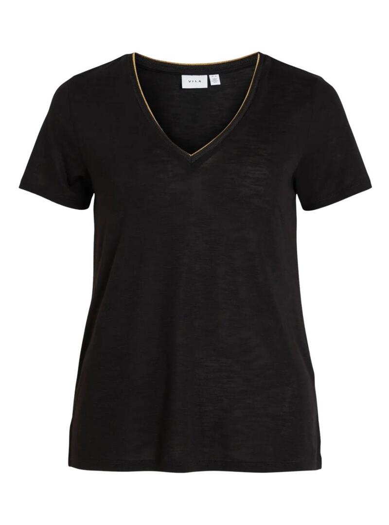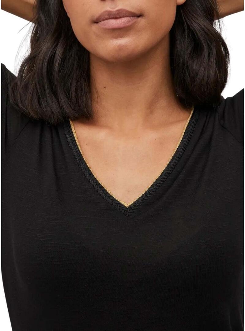 Camiseta Vila. Modelo Noel. Cor preta. Decote em V. Manga curta. Tecido mesclado. Decote com acabamento em canelado trançado com detalhes dourados. Borda levemente arredondada.