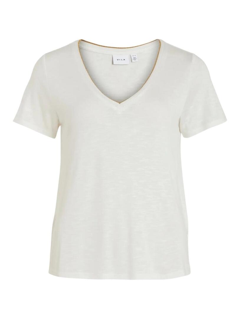 Camiseta Vila. Modelo Noel. Cor branca. Decote em V. Manga curta. Tecido jaspeado. Decote acabado em canelado trançado com detalhes dourados. Base levemente arredondada.