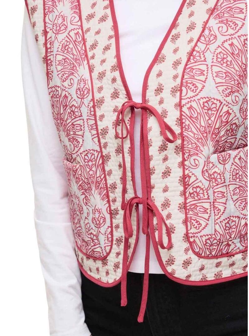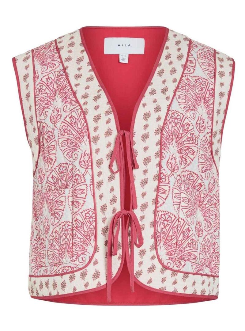 Colete Vila. Modelo Delphine. Cor coral e branco. Acolchoado com enchimento leve. Encerramento com cordões. Estampa boho.