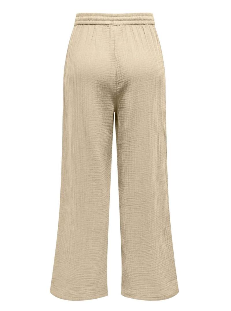 Calça Only. Modelo Thyra. Cor bege. Perna larga. Cintura elástica com cordão ajustável. Bolsos laterais. Tecido macio e respirável.