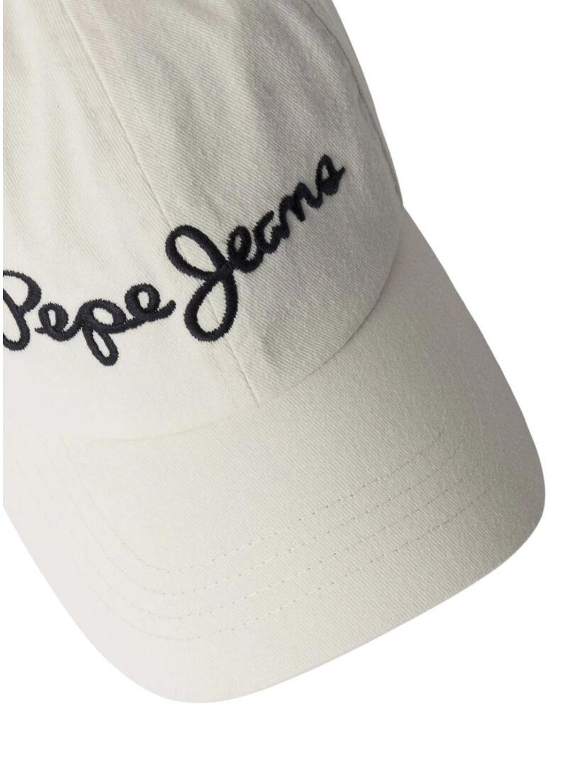 Boné Pepe Jeans. Modelo Alix. Cor branca. Fecho traseiro ajustável metálico. Ilhós de ventilação. Logotipo bordado na parte frontal em preto. Efeito desgastado. Logotipo de Londres na parte traseira. Formato curvo com detalhes nas costuras.