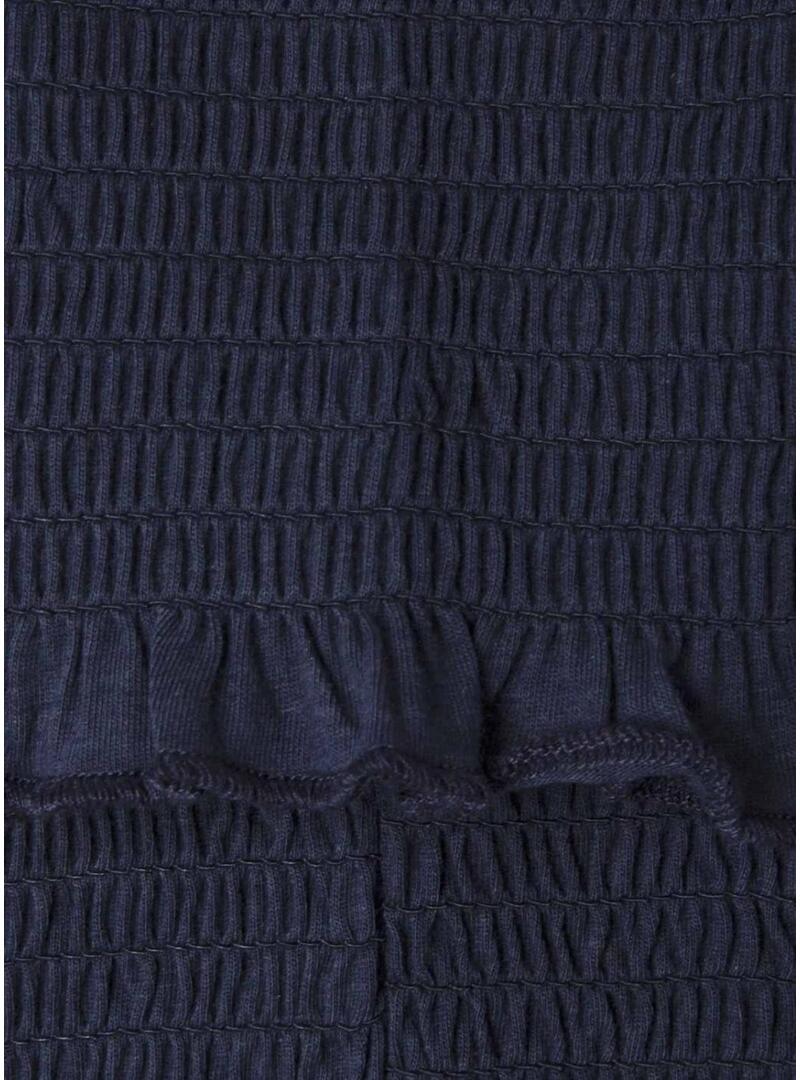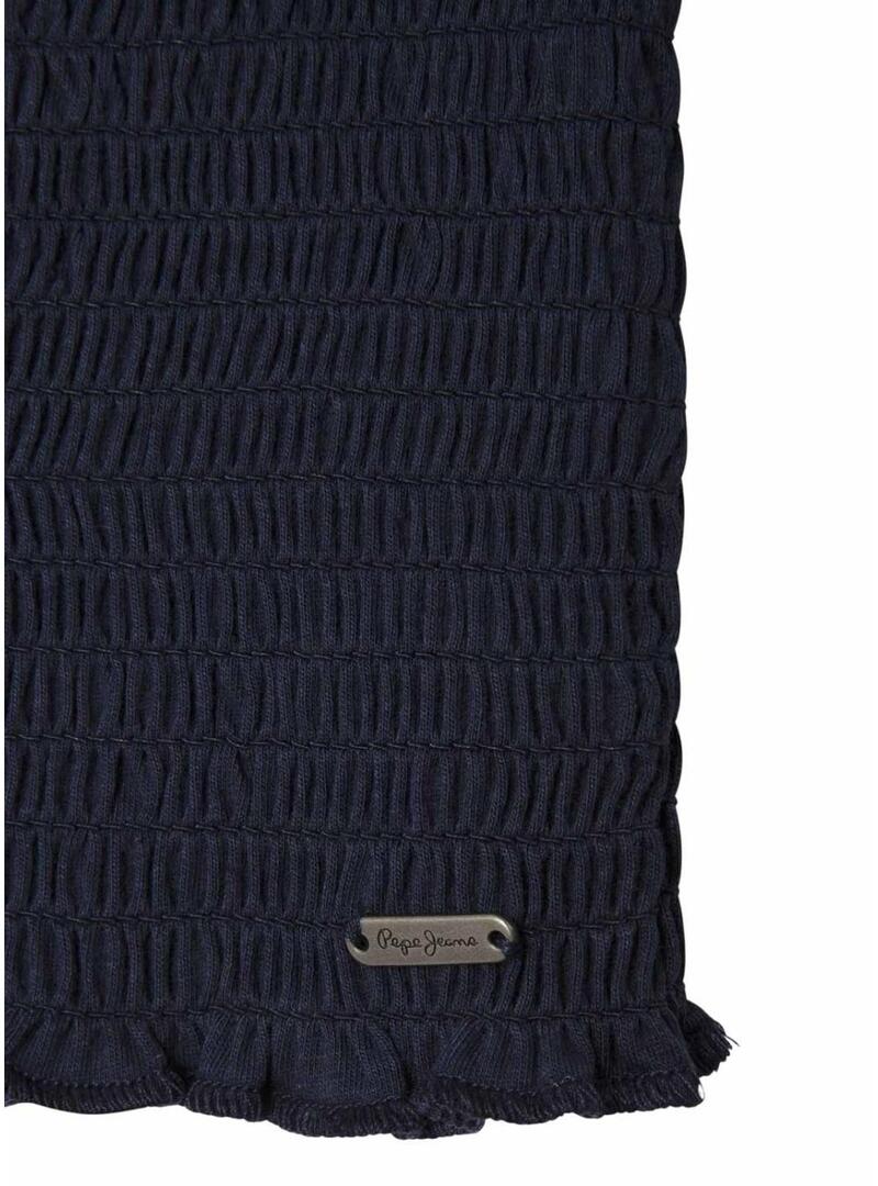 Camiseta Pepe Jeans. Modelo Georgina. Cor azul marinho. Acabamento com mini babados. Manga curta. Cor uniforme. Placa metálica com o logo da Pepe Jeans. Barra cropped.