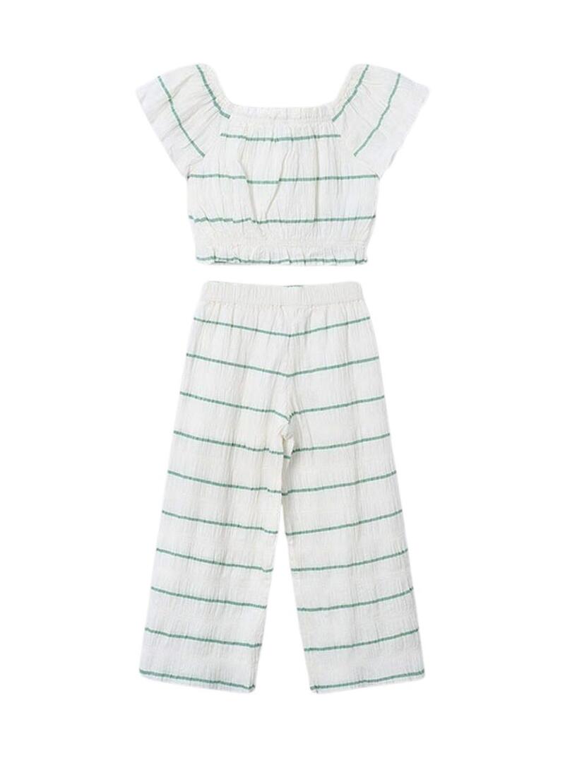 Conjunto de 2 peças Mayoral. Cor branca com listras verdes. Cintura elástica. Gola redonda. Manga curta. Calça comprida e top listrado.