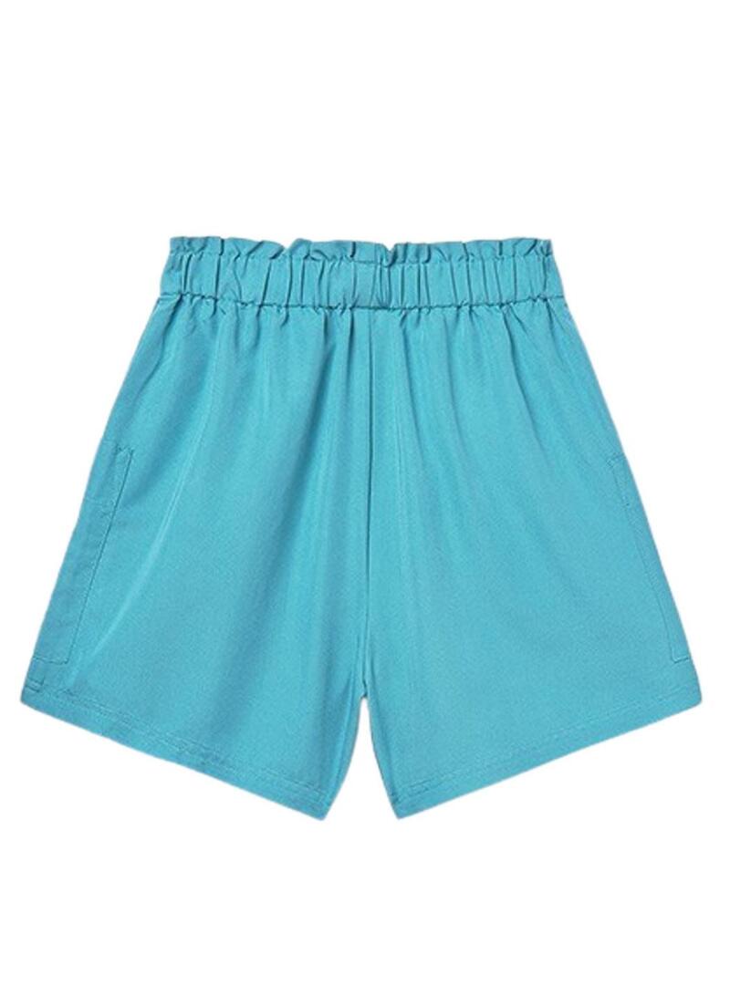 Short Mayoral. Cor turquesa. Tecido fluido. Cintura elástica. Laço ajustável. Bolsos frontais. Cintura alta. Corte amplo. Borda reta.