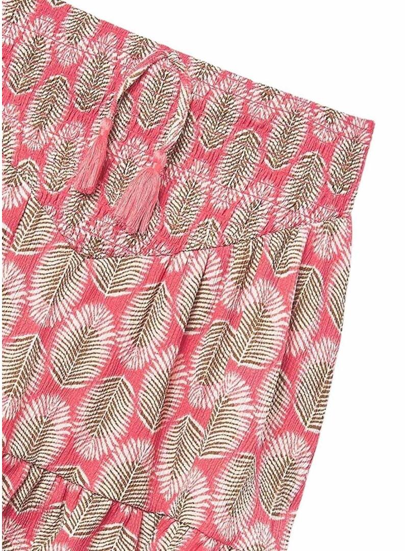 Saia Mayoral. Cor coral. Estampa de folhas. Cintura elástica. Laço decorativo. Babado na parte inferior. Corte fluido. Estilo evasê.
